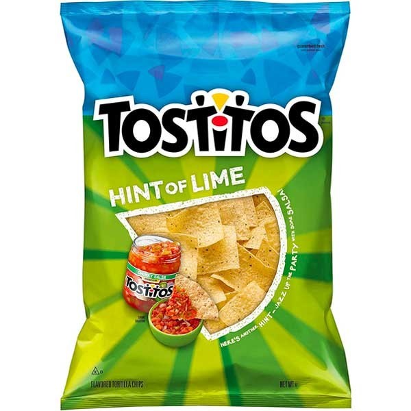 TOSTITOS Hint of Lime Flavored Tortilla Chips er den originale tortilla chip, som du elsker, men med en skarp limesmag til at komplimentere alle dine yndlingsdips. Dine smagsløg vil ikke kunne andet end at danse en skarp salsa, så begynd bare at dyppe!