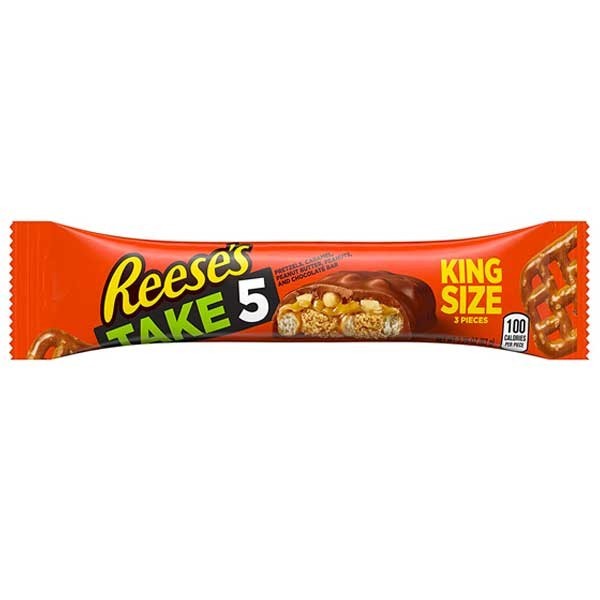 Få en unik blanding af fem gode smagsvarianter med denne chokoladebar, med smag af chokolade, karamel, saltkringler, peanuts, og den gode Peanut Butter fra Reese's. Reeses Take 5 King Size er en perfekt snack til at holde dig kørende gennem hele dagen!