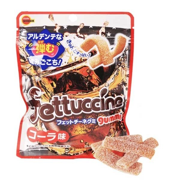 Slikket er formet som fettuccinepasta – fladt og tyndt, men lige så blødt som en sky af slik! Den søde vingummi og det sure pulver ovenpå gør det til en perfekt kombination! Denne vingummi med colasmag er dækket med sukker og syrligt pulver, som får den til at knase, når du tygger på den. Genlukkelig pose, som holder dem friske.