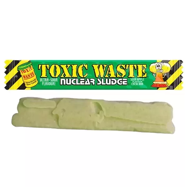Toxic Waste Nuclear Sludge Chew Bar - en syrlig sensation! Få den ultimative smagsudfordring med denne intense æble-syrlige tyggegummi-stang. Formuleret til at give en længerevarende syrlig effekt end traditionelt slik, starter den med en eksplosion af syrlighed, der gradvis giver plads til en frugtagtig afrunding. Perfekt til at dele med venner eller når du har brug for et ekstra energipåfund. Kun for de modige!