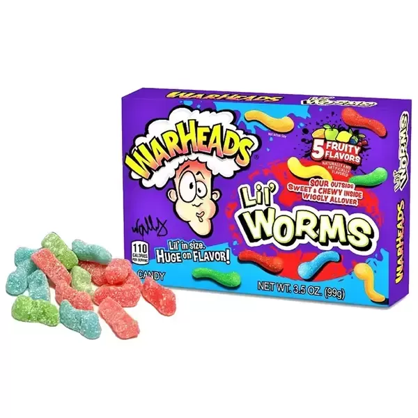 Warheads Lil' Worms kombinerer en intens sur overflade med et sødt og sejt indre. Disse farverige vingummiorme kommer i fem friske frugtsmage: citron, grøn æble, appelsin, sort kirsebær og blå hindbær. Hver orm starter med et kraftigt surt spark og afsluttes med en sød, frugtig eftersmag. Den perfekte godbid til dig, der elsker ekstremt surt slik og sjove former. En pose fyldt med velsmagende og wiggly underholdning!