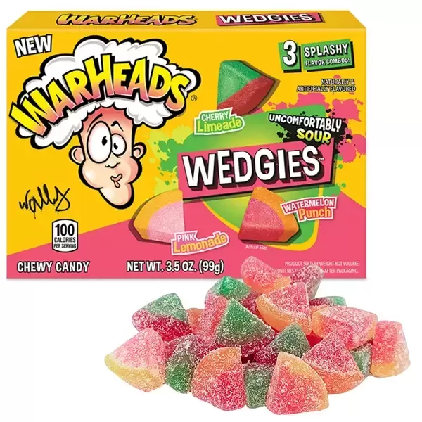 Warheads Wedgies er ekstremt syrlige slik der vil få dine smagsløg til at eksplodere! Hver pakke indeholder en blanding af vanvittigt syrlige smagskombinationer: cherry limeade, watermelon punch og pink lemonade. Hvert trekantede stykke kombinerer to intense smage i én bid - først den sprudlende syrlighed, derefter den søde frugtagtige afrunding. Disse amerikanske favoritter er berømte for deres mundskærende styrke og unikke, bløde tekstur. Kun for de modige sjæle der tør udfordre deres smagsgrænser! Perfekt til at teste dine venner eller tilføje et ekstra kick til din slikoplevelse. Vær advaret - dine læber vil krumme sig!